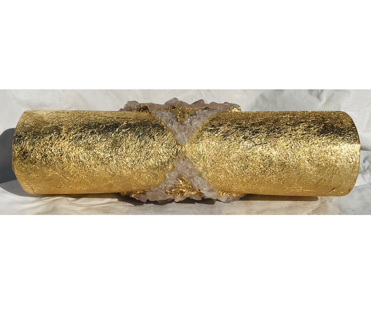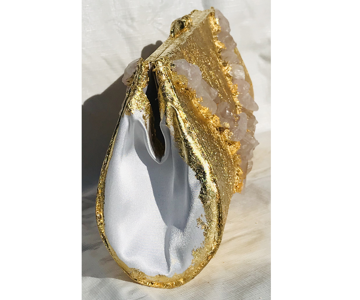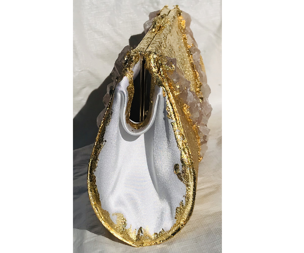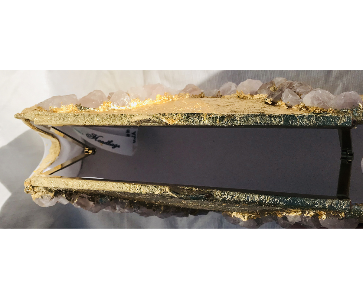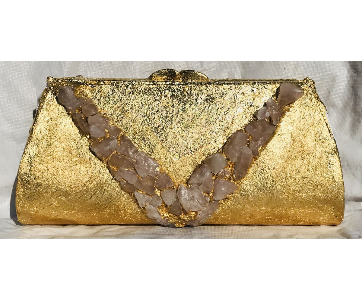 I used genuine gold plating and genuine chunks of raw Rose Quartz to create this lovely purse.