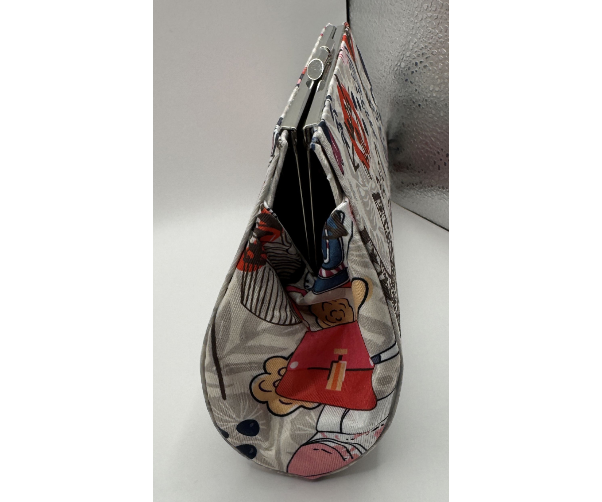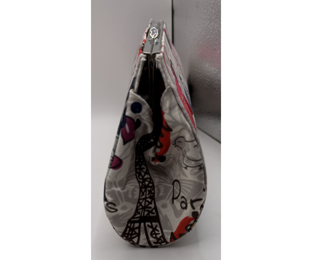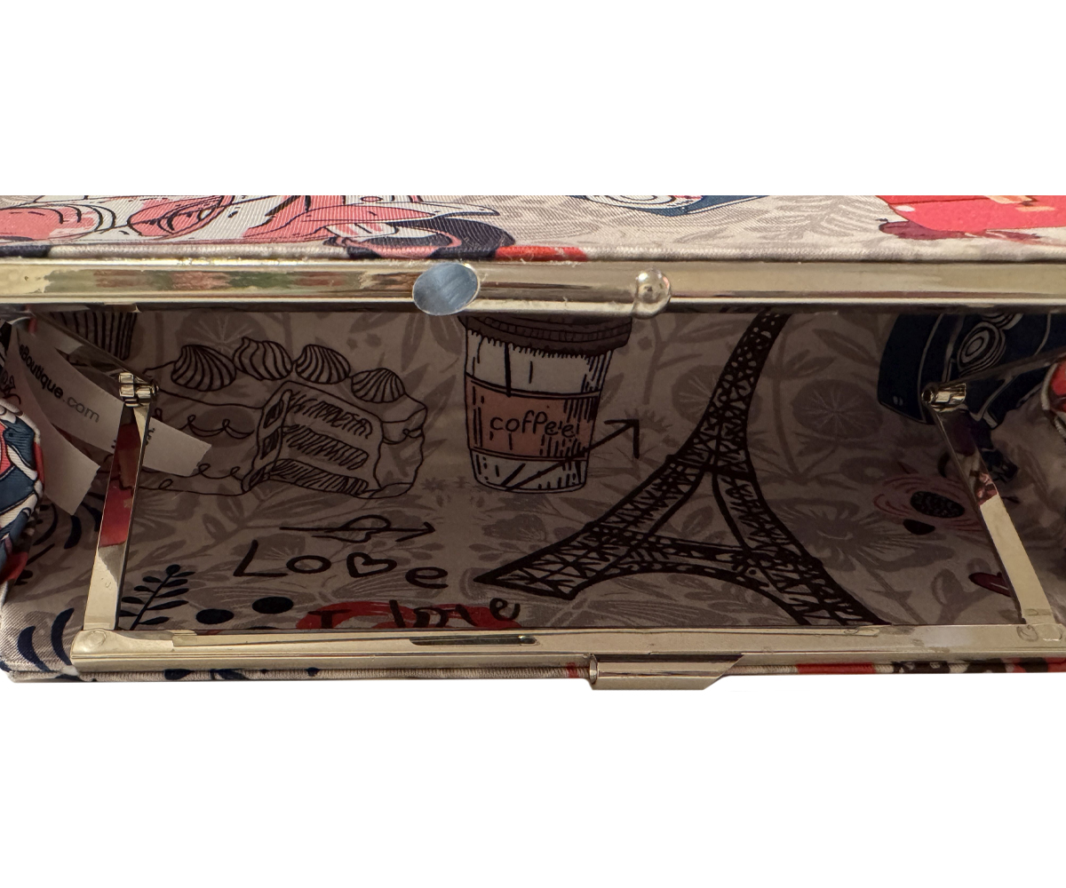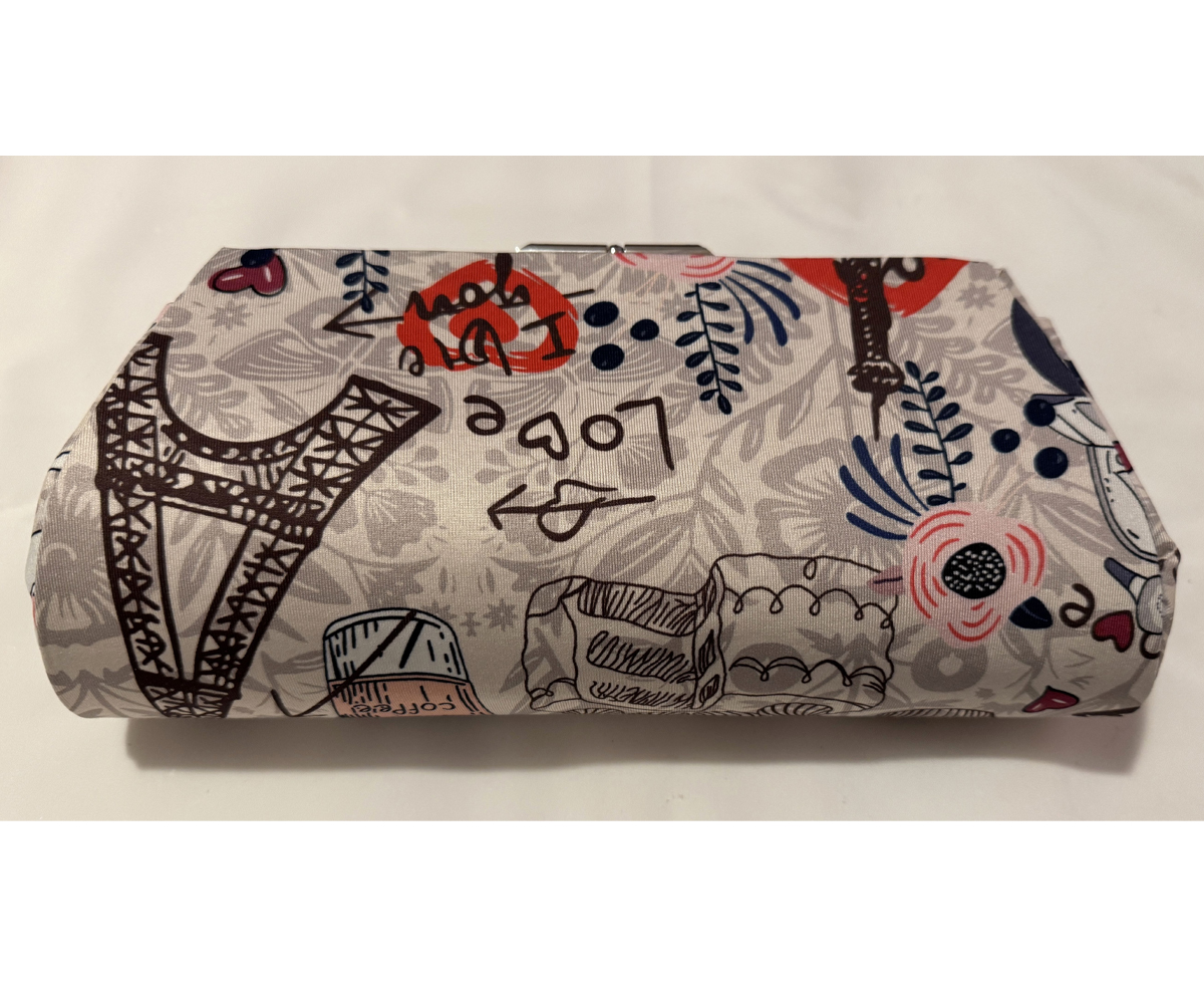 Carry a piece of Paris with you wherever you go with this one-of-a-kind clutch. Its whimsical fabric features iconic illustrations of a scooter, a chic handbag, hearts, and cameras, all against a charming Parisian backdrop. Handmade with my signature no-sew, hard-shell method, this clutch is both sturdy and stylish, making it the perfect accessory for a night out or a trip to your favorite coffee shop
