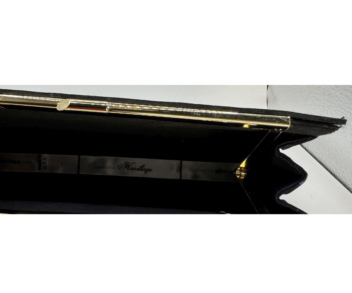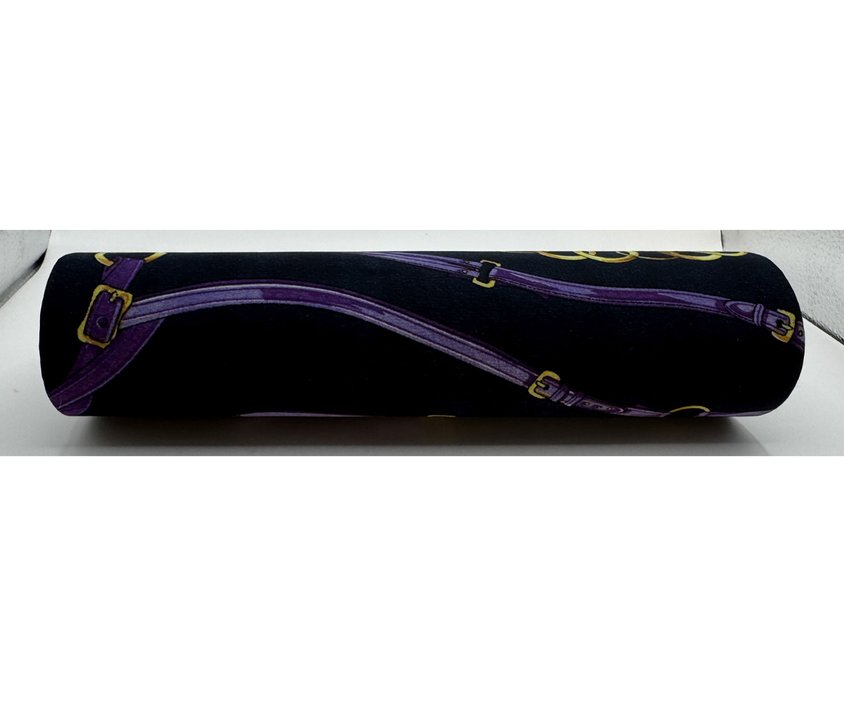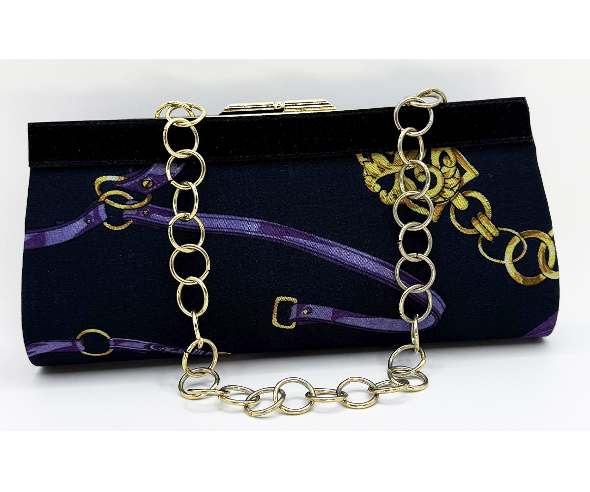 This unique, handmade clutch combines luxurious textures with a classic, eye-catching pattern. The body of the purse features a bold print of intertwined gold chains and purple straps on a deep, dark fabric. It’s finished with a soft black velvet band and a polished gold-tone clasp. This versatile clutch is a statement piece perfect for a night out or adding a touch of glamour to your everyday style. Crafted with my sturdy, hard-shell method, it’s a durable and beautiful accessory you’ll enjoy for years to come.