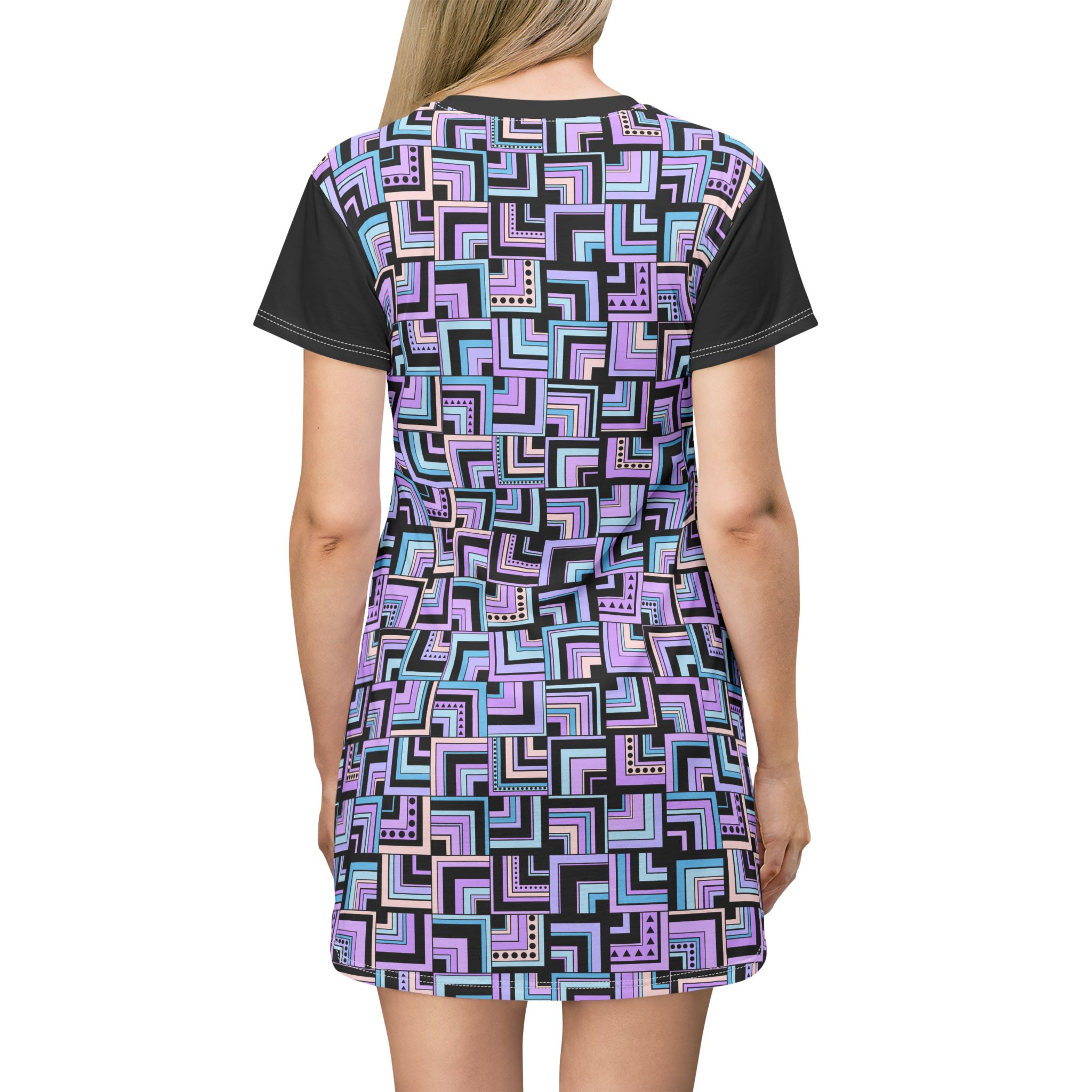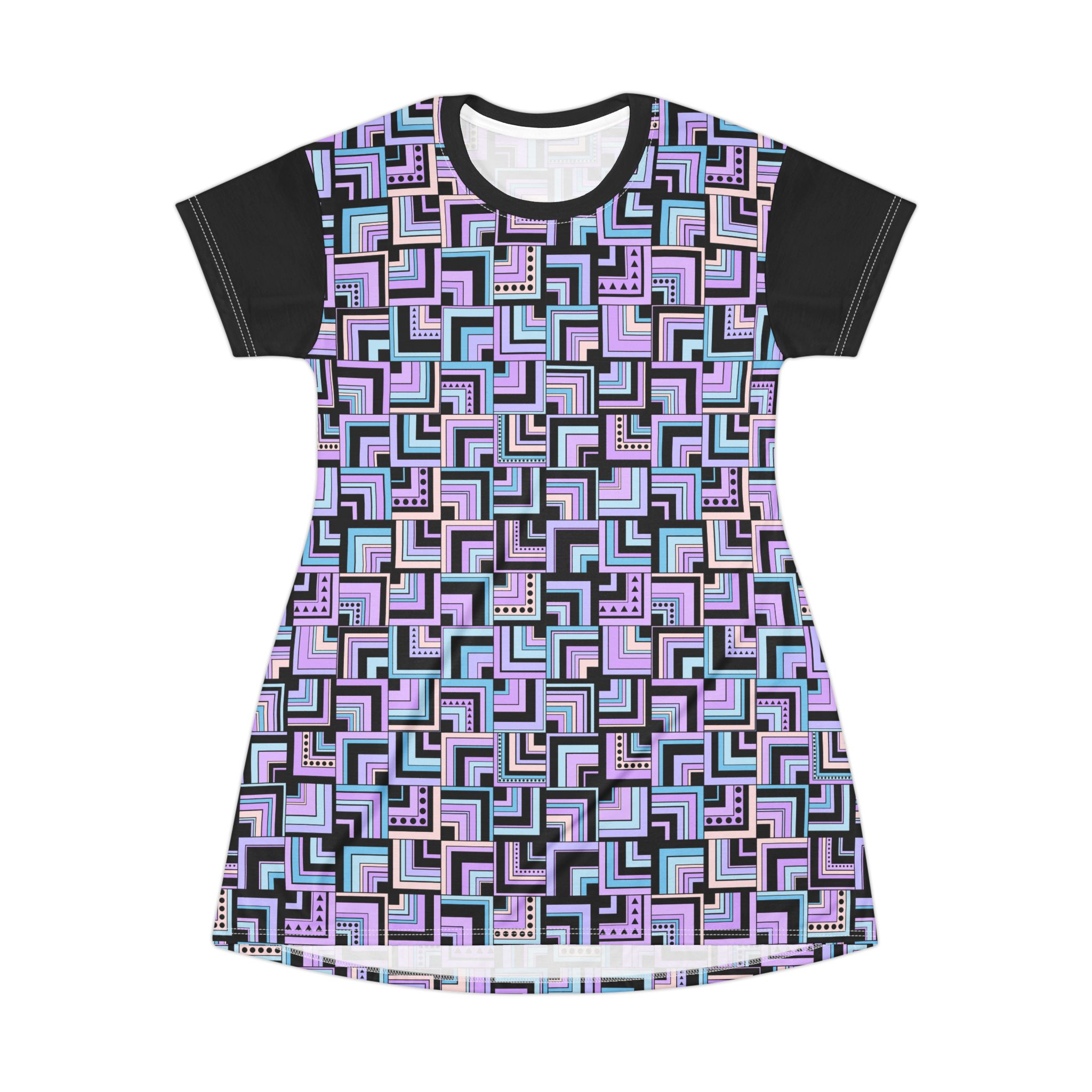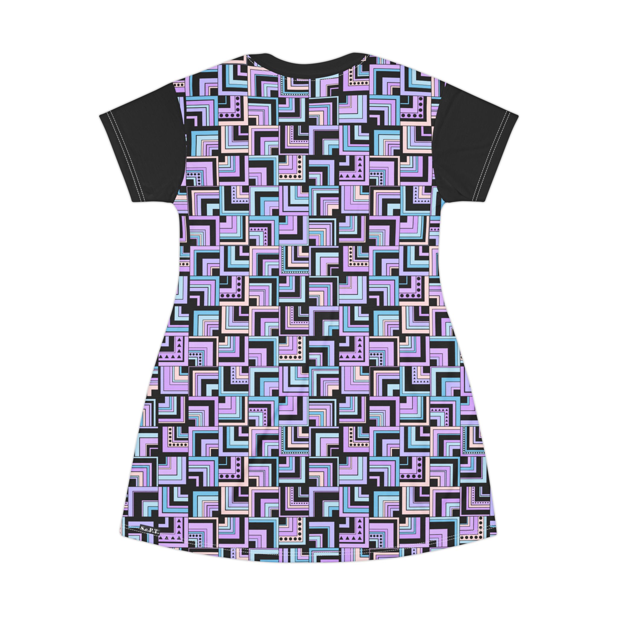 Blue & Lavender Retro Corner Block Geometric Print T-Shirt Dress (S.e.P.T.™)