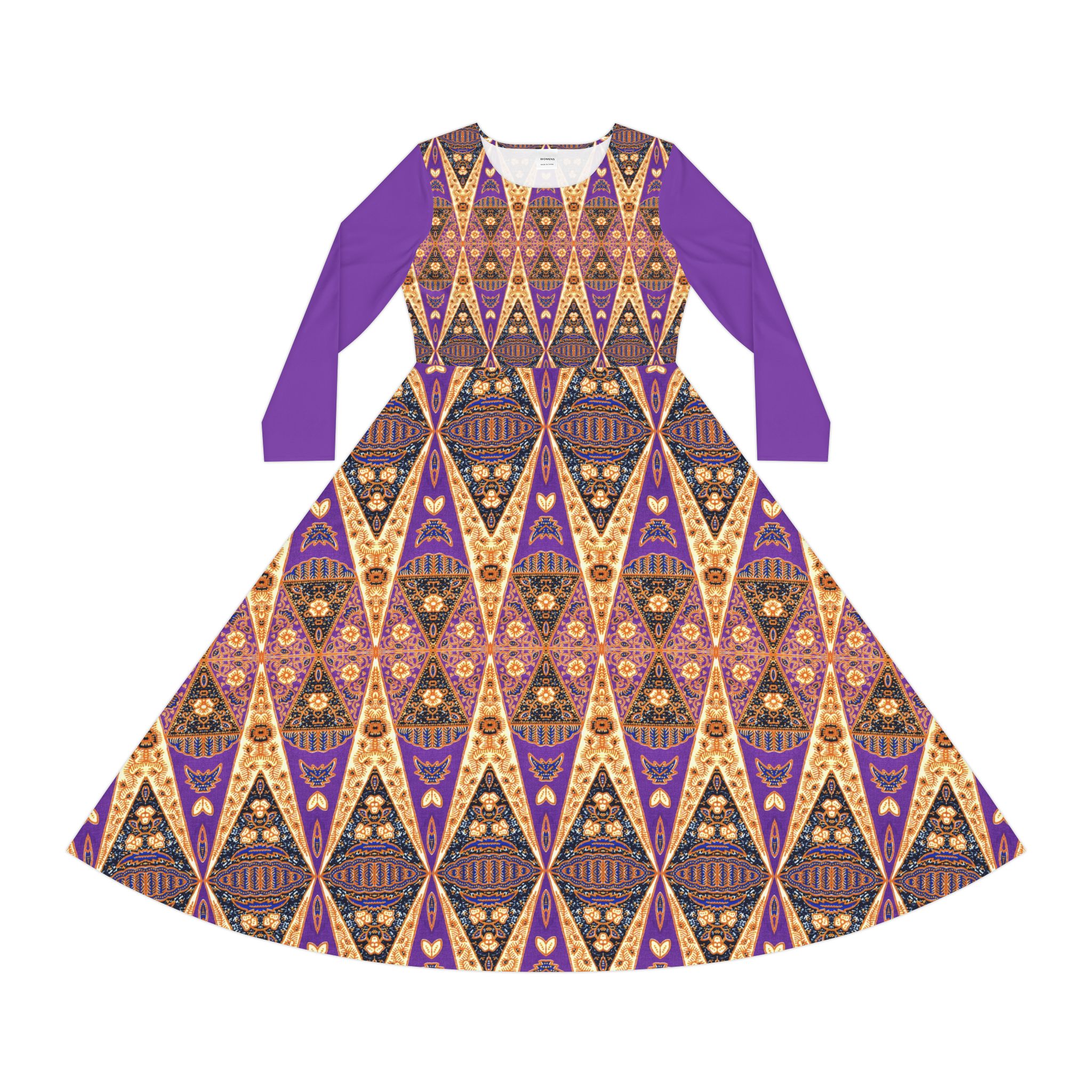 Bohemian Regal Purple and Tan Geometric Pattern Women’s Long Sleeve Dress (S.e.P.T.™)