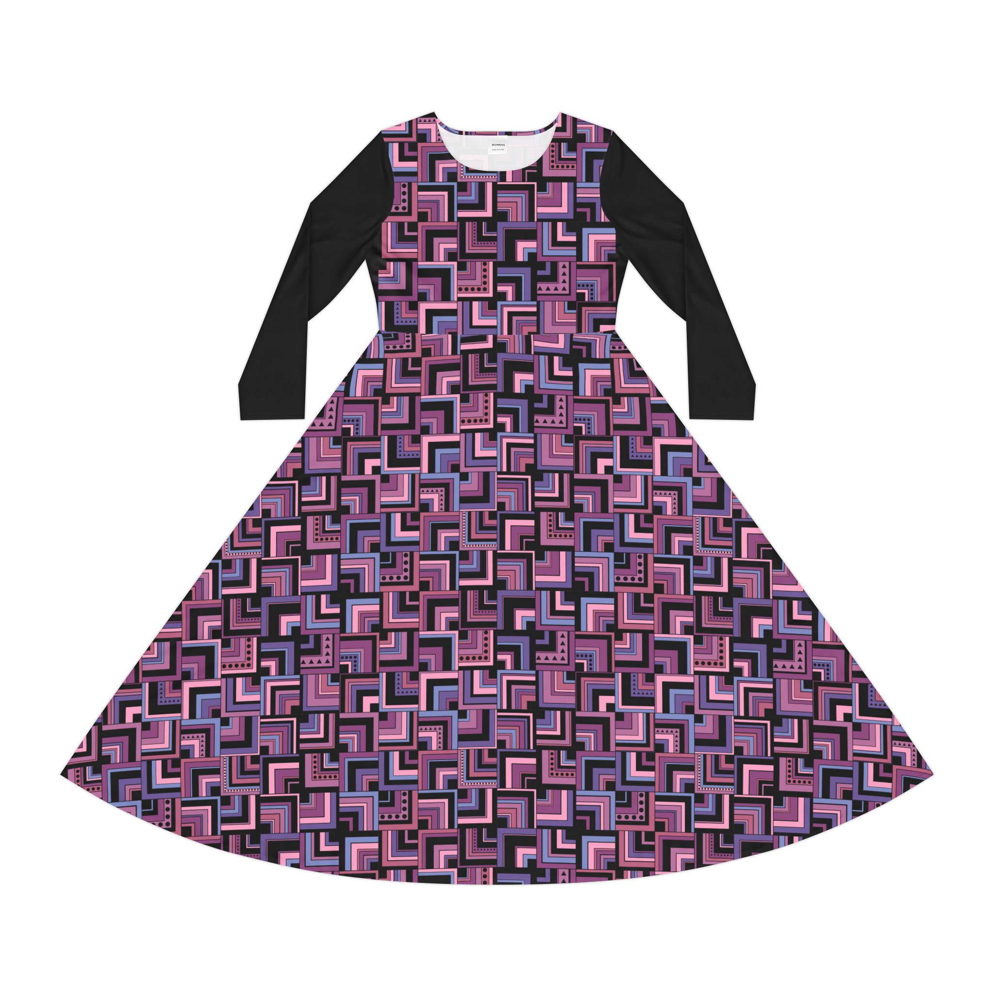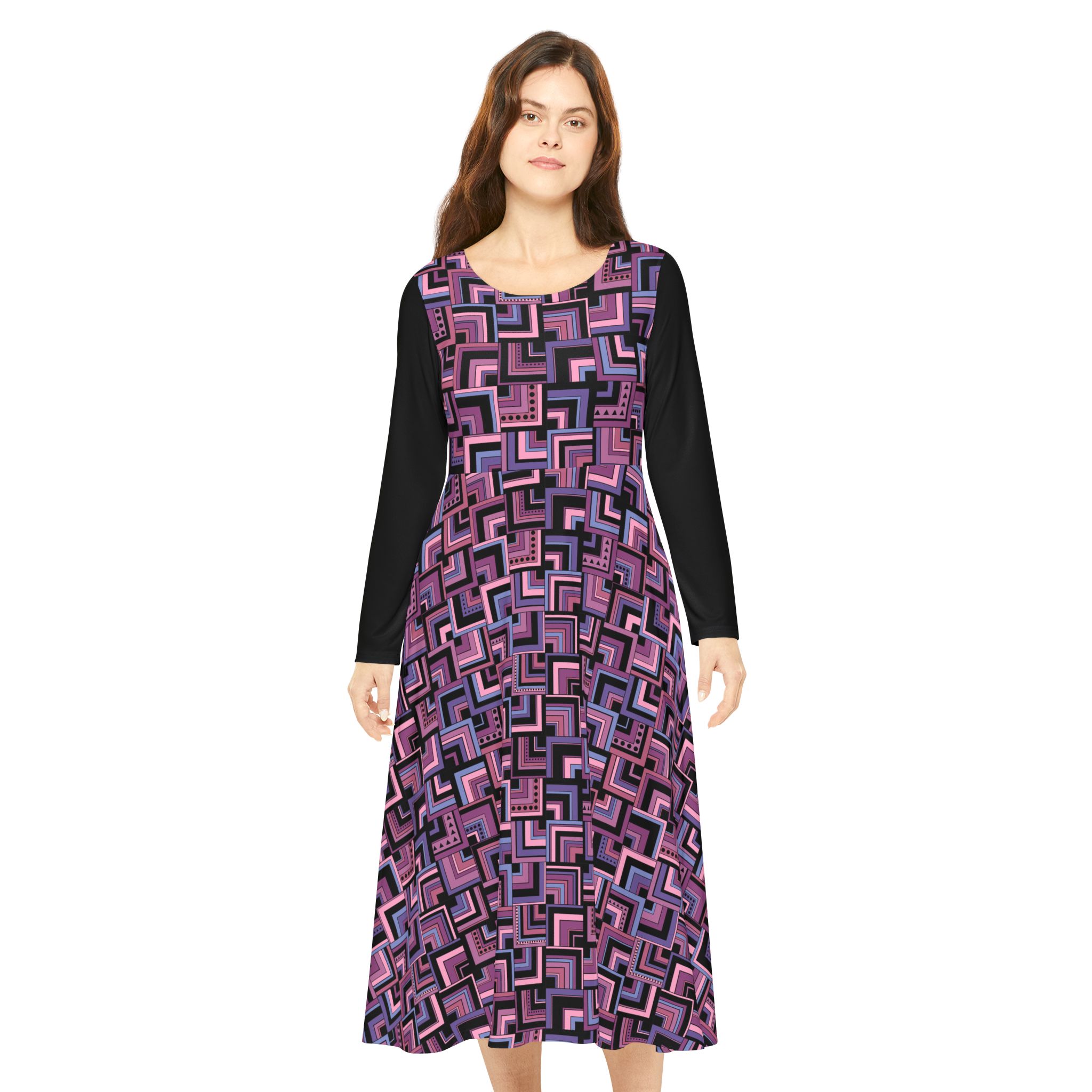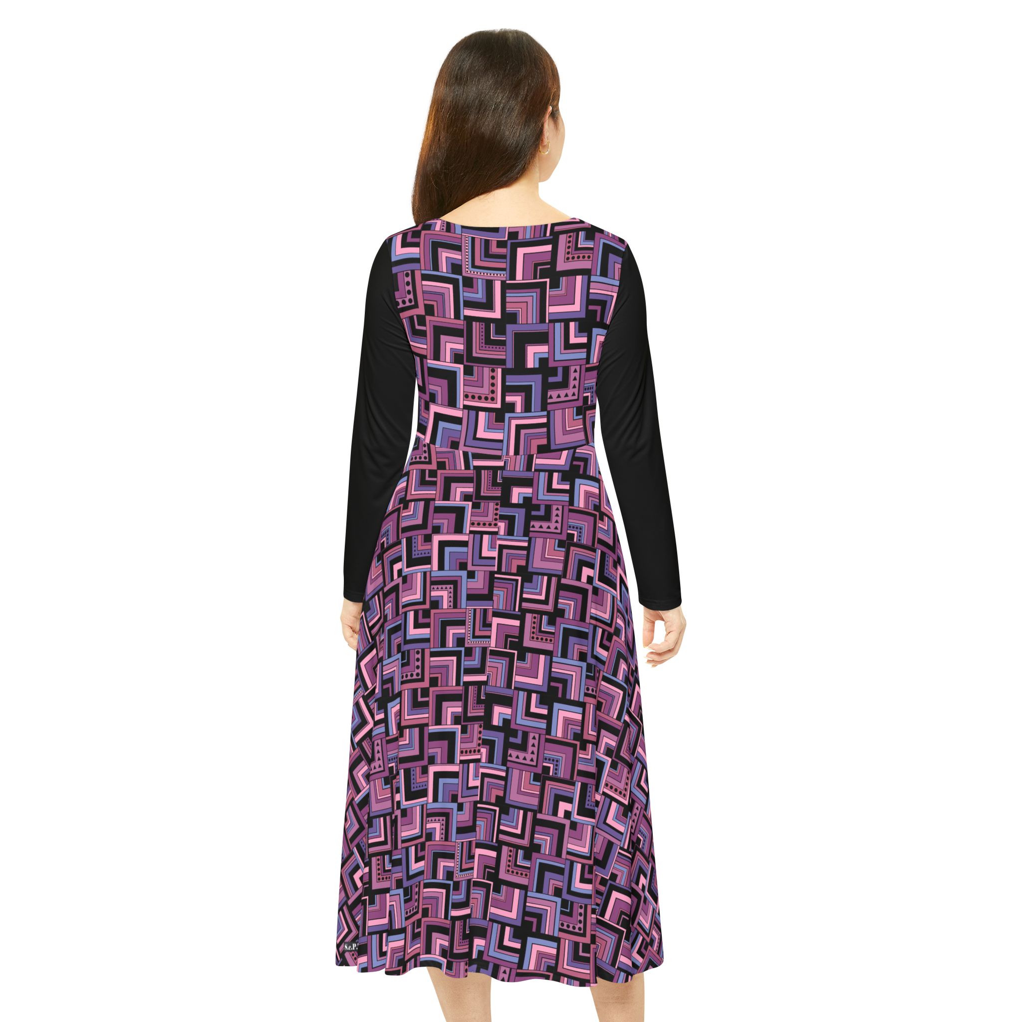 Purple Retro Corner Block Geometric Print Women’s Long Sleeve Dress (S.e.P.T.™)