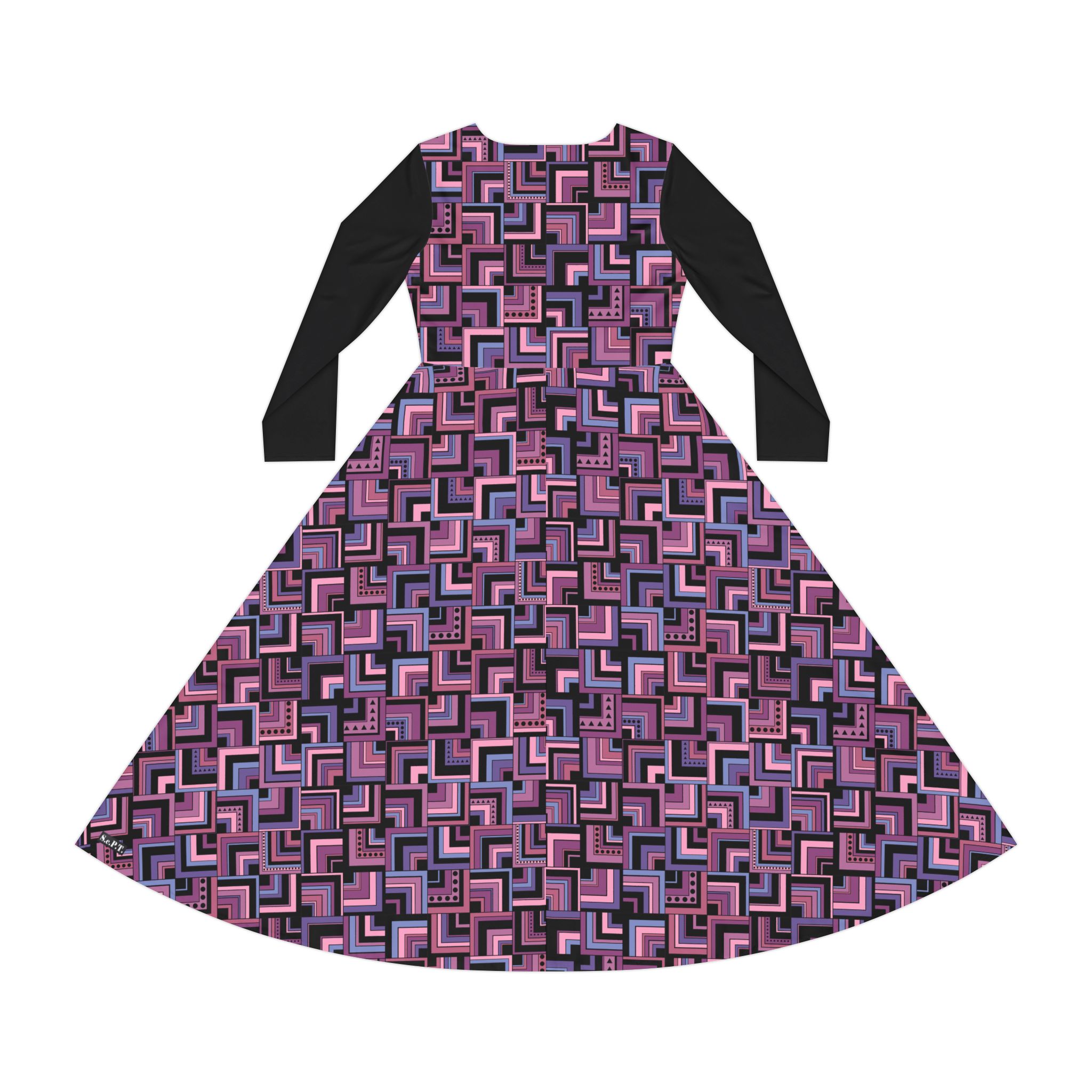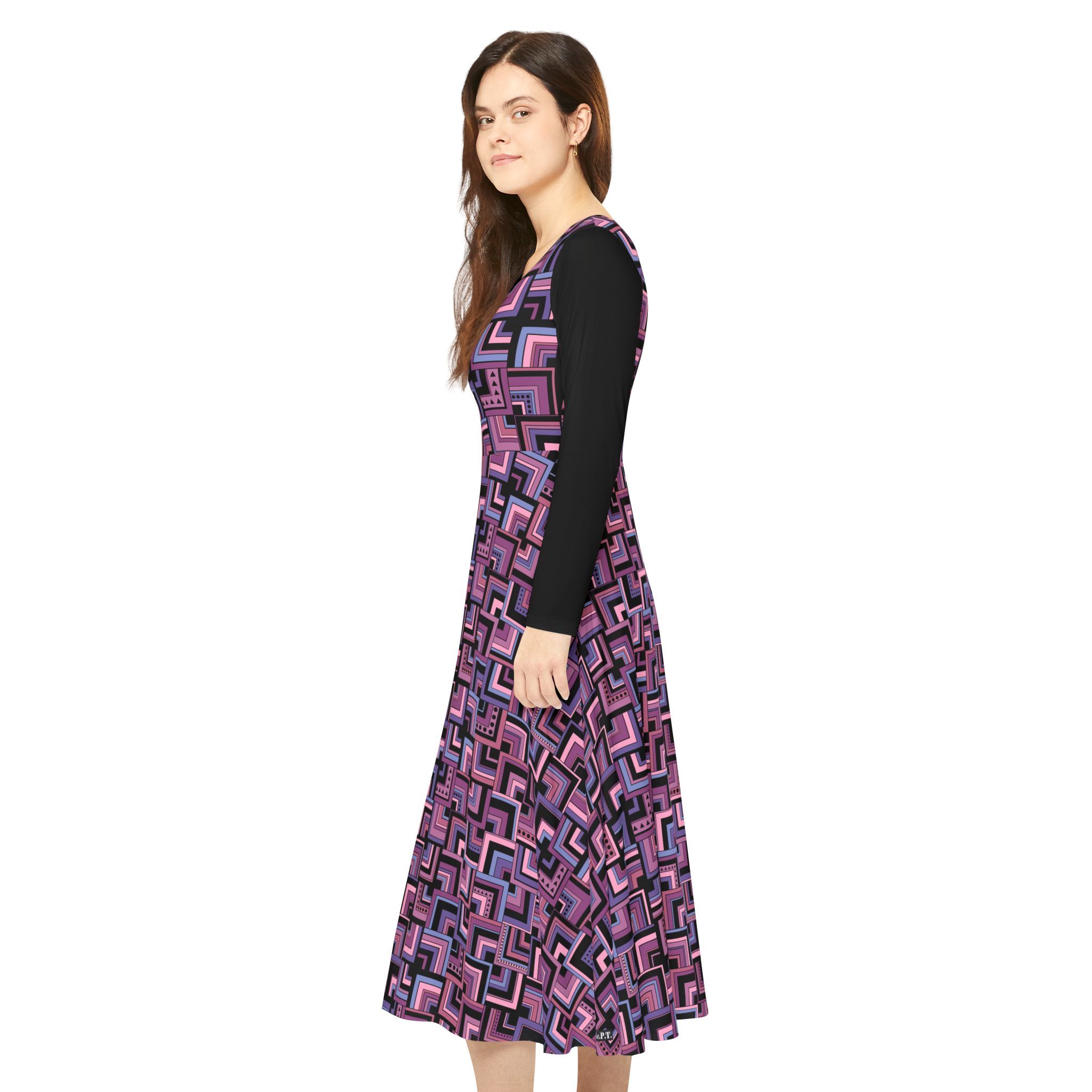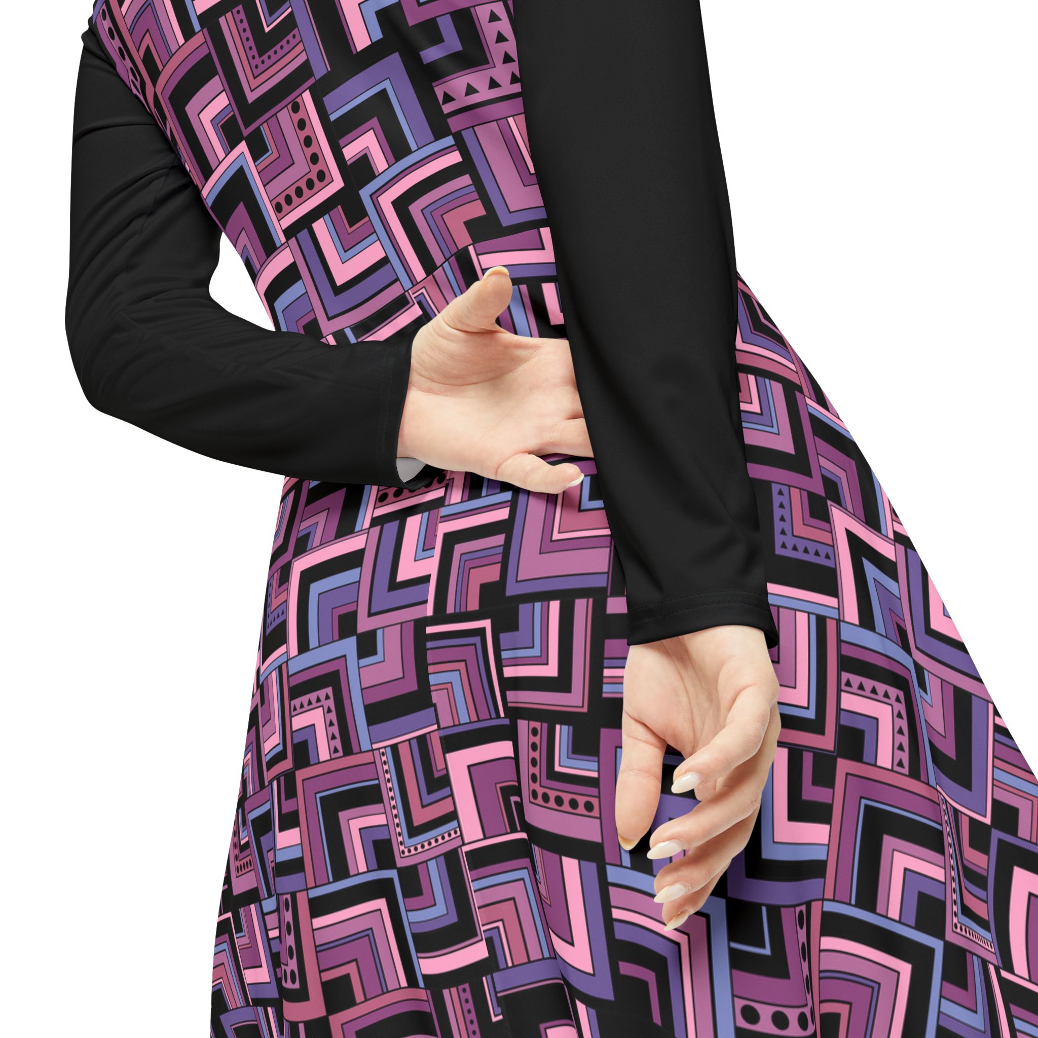 Purple Retro Corner Block Geometric Print Women’s Long Sleeve Dress (S.e.P.T.™)