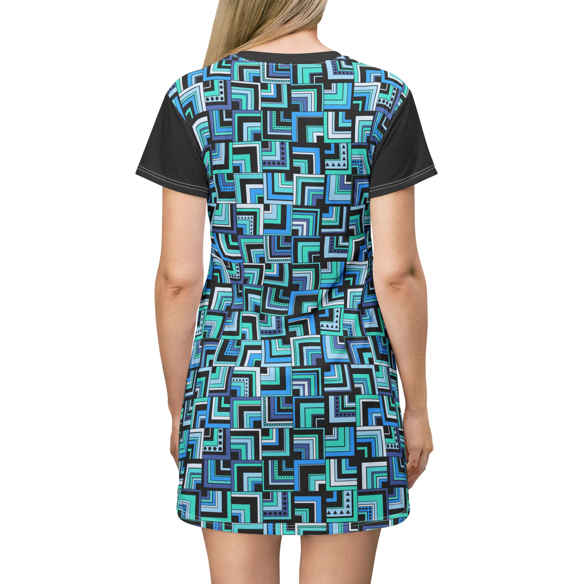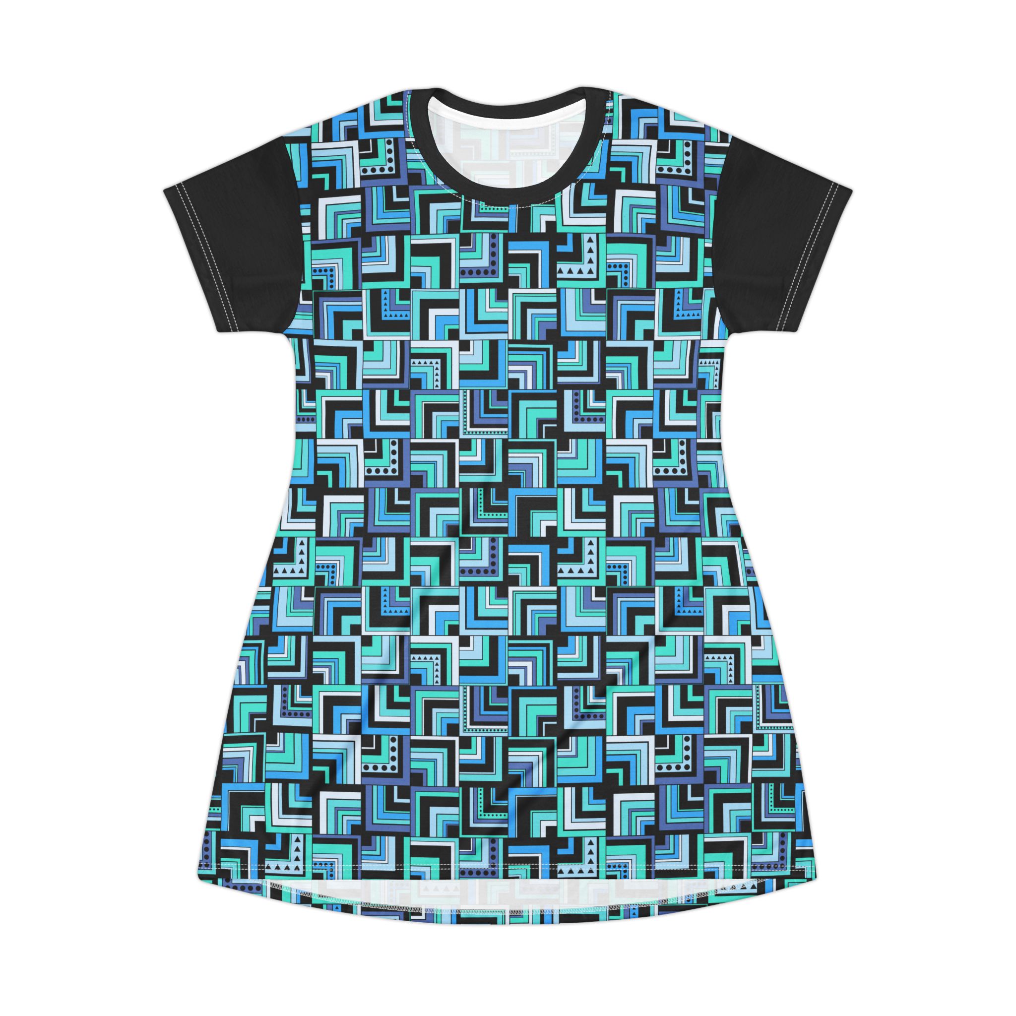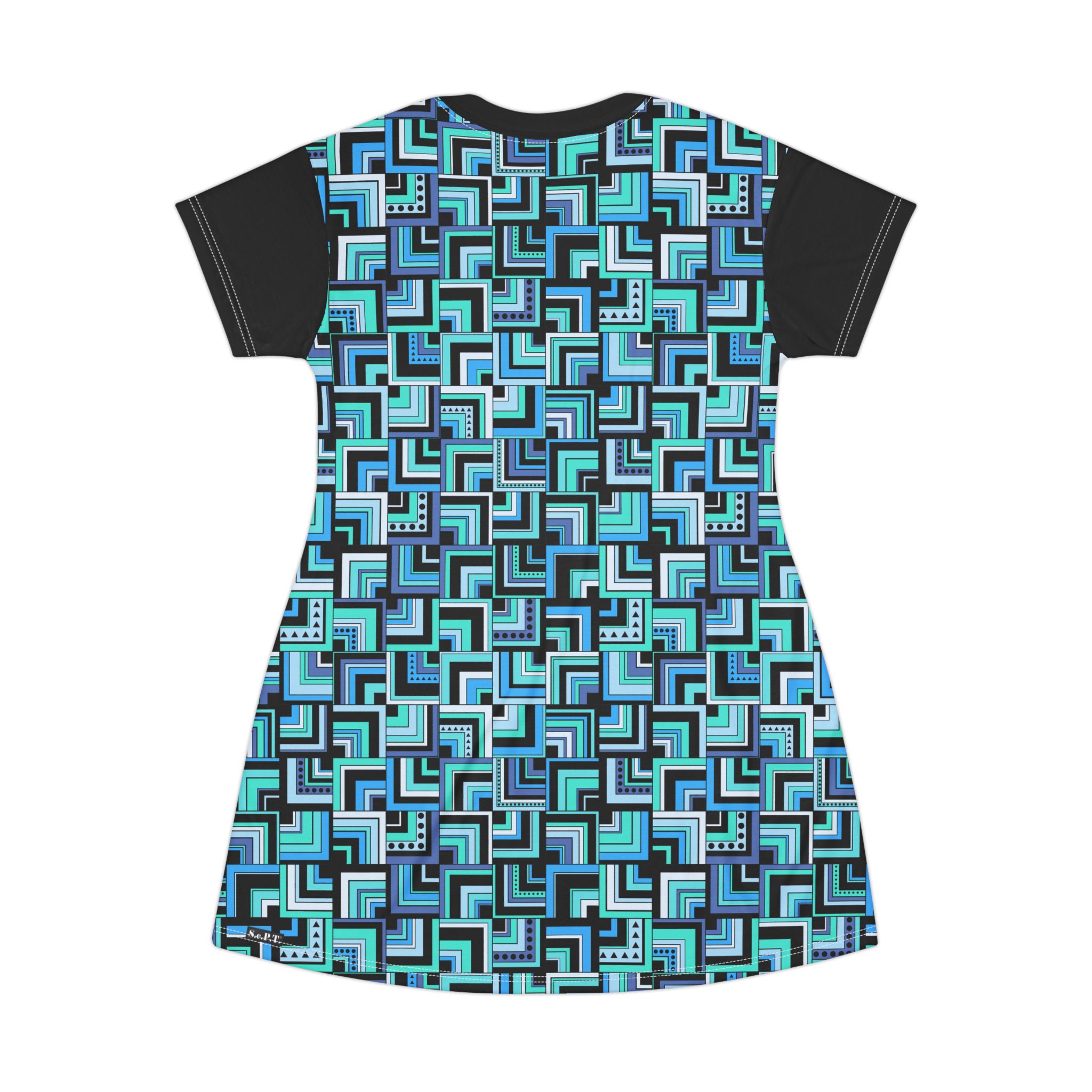 Blue Retro Corner Block Geometric Print T-Shirt Dress (S.e.P.T.™)