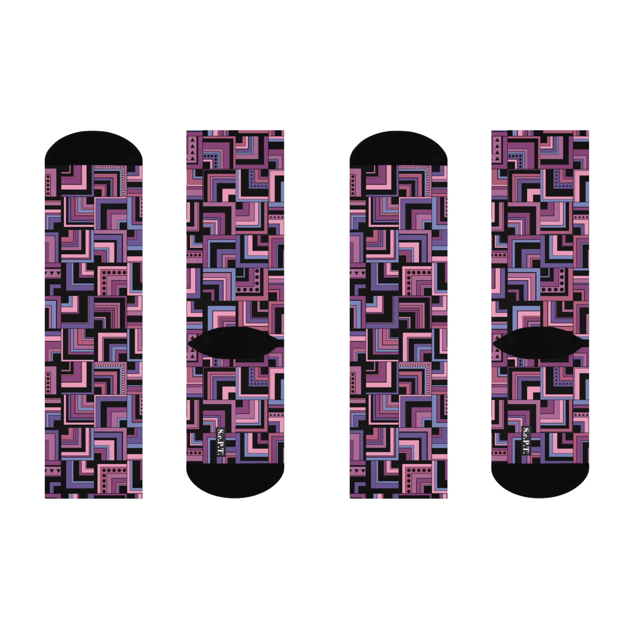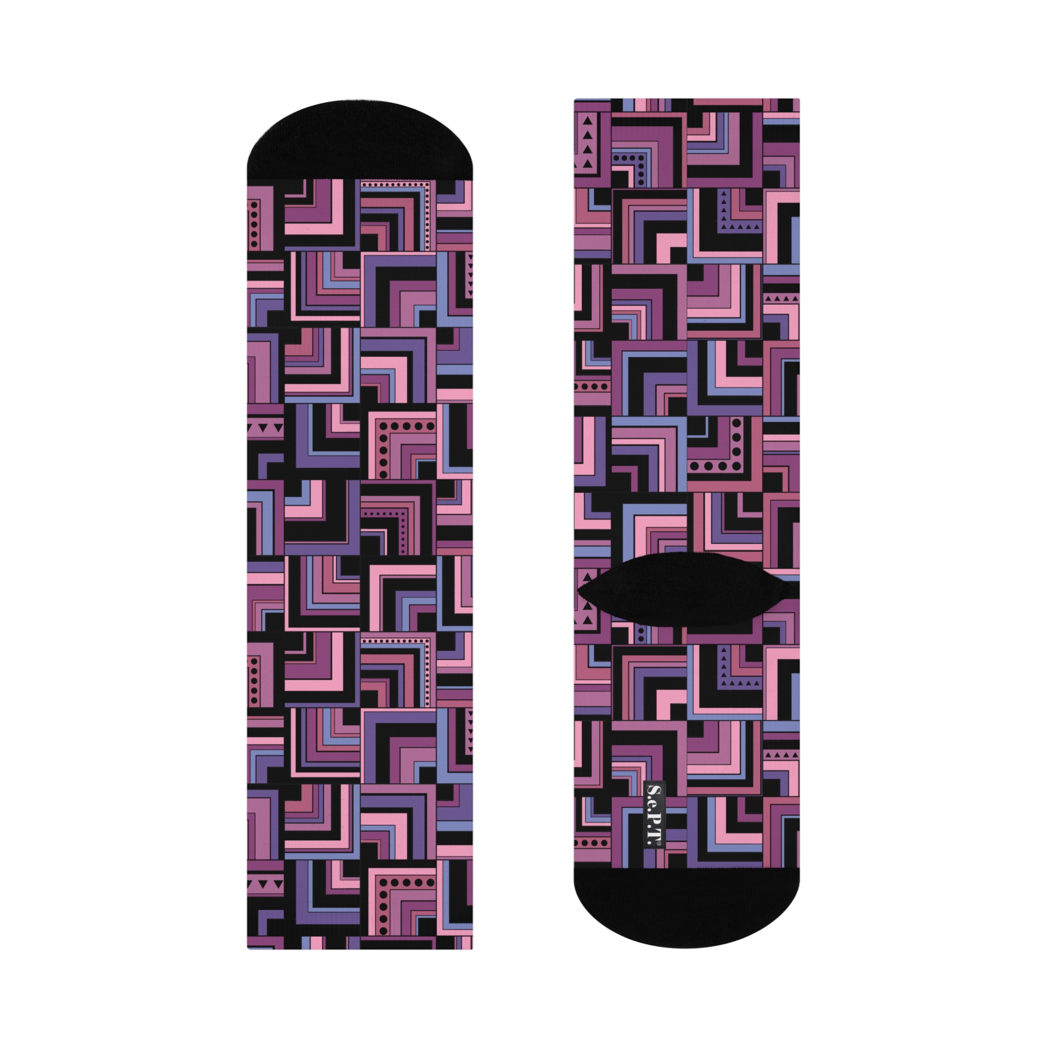 Purple Retro Corner Block Geometric Print Cushioned Crew Socks (S.e.P.T.™)